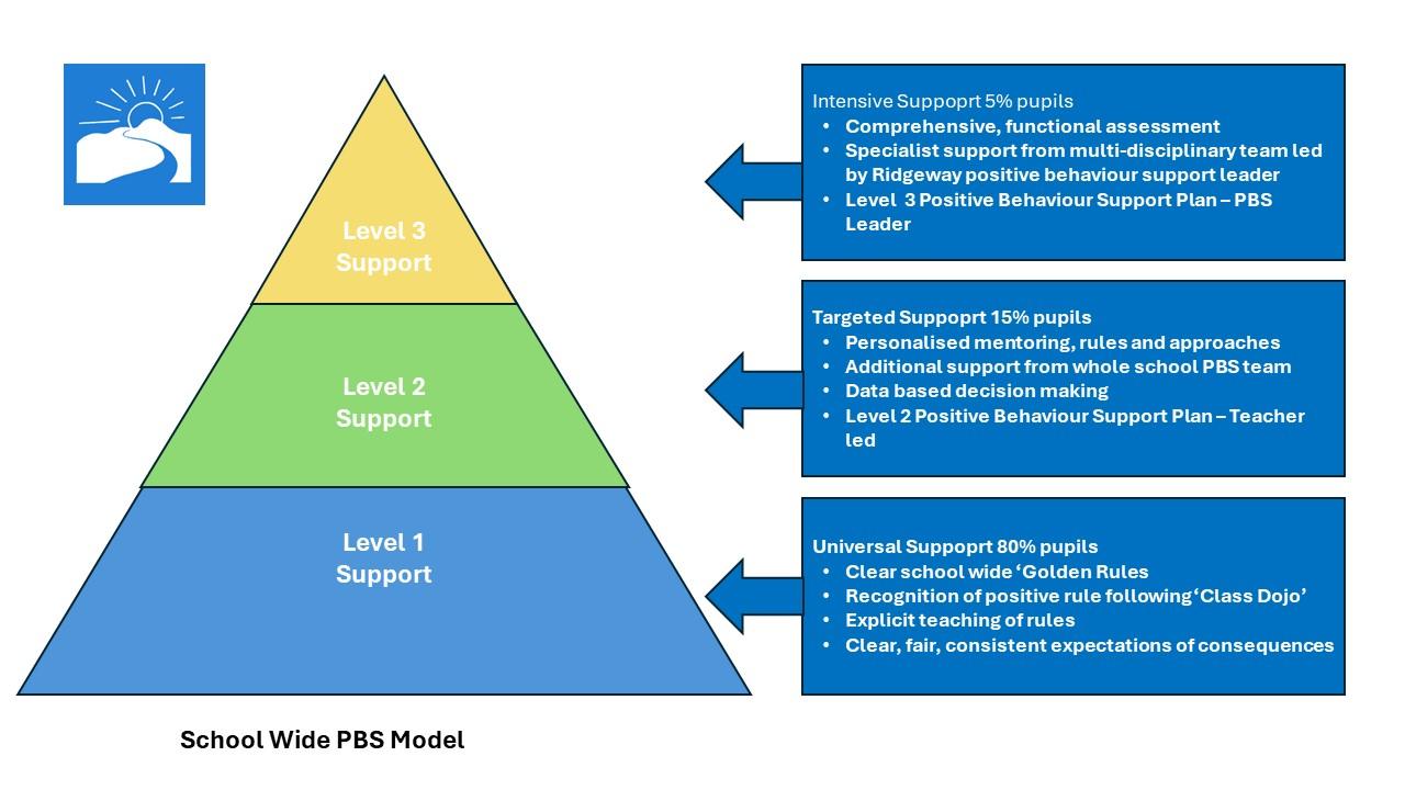 Ridgeway has adopted a three-tier school and college wide model of Positive Behaviour Support (PBS). The aim of PBS is to improve the lives of individual pupils and those around them. We aim to do this by teaching new skills to replace behaviours of concern or challenge. The pupil is placed at the heart of every decision we make and PBS plans are created in partnership with families, carers and any other key stakeholders.