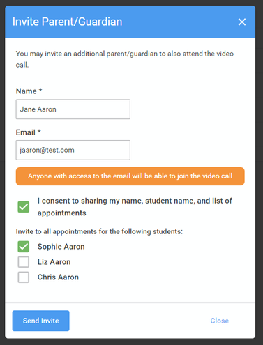 You can give another parent/guardian access to join your video appointments in respect of each student linked to you that is involved in the conference. You can grant this access at the time of booking, or later if required.