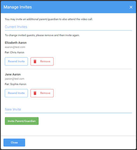 3. You will then see a  Manage invites box that shows your sent invitation(s), allows you to add another invite if you have any more available (you can have one invite per student, if wished), and allows you to Resend invites or Remove them. If you have no more invitations available the green button will be replaced with a message that says Unable to invite another parent/guardian. Only one invite can be sent per student.