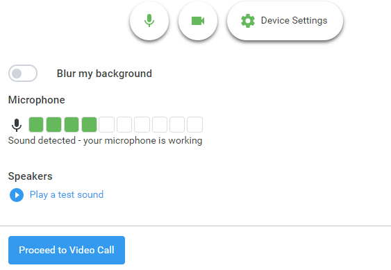 From here you can blur your background in video calls (if using Chrome), turn on or off your microphone and camera, change which devices are being used for the call, and check your microphone and speakers. Once you are happy, click  Proceed to Video Call.