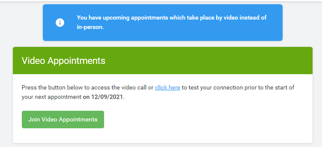 The green  Join Video Appointments button allows you to join your appointment on the day - or to test your camera/microphone at any time.